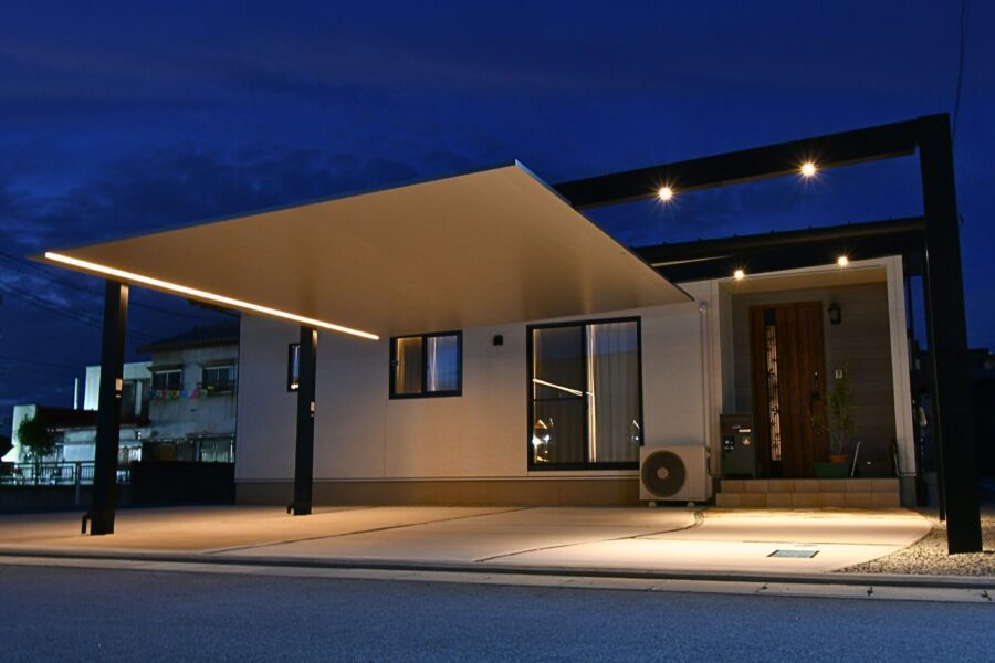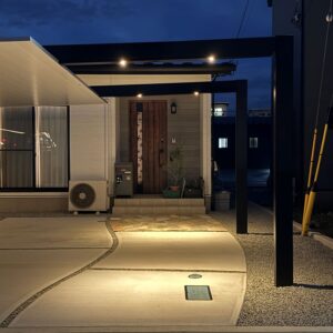 夜はいつもライトがほんのりと点灯していて、人が近づくと明るくなって足元を照らしてくれるので安心感があります。カーポートの梁を延長してもら