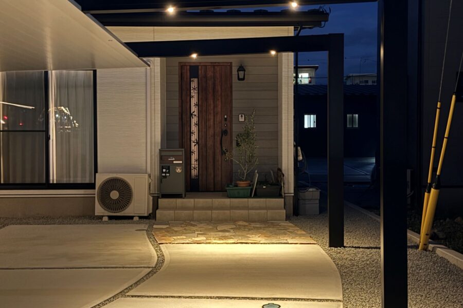 玄関と道路をつなぐアプローチは、柔らかな曲線を描くデザインにしました。直線で構成された建物やカーポートに対し、あえて曲線を取り入れることで、空間全体にやさしい印象をプラスすることが狙いです。足元には淡いベージュ系の天然石を敷き、玄関まわりを明るい印象に仕上げました。さらに、夜になるとライトがやわらかく足元を照らし、アプローチ全体に温かみのある雰囲気が広がります。