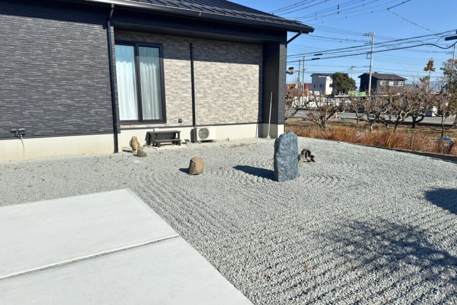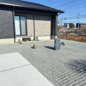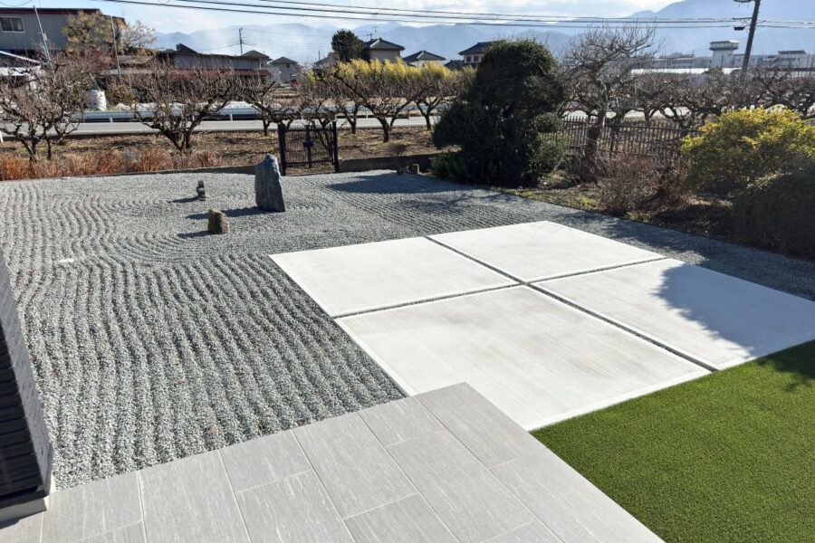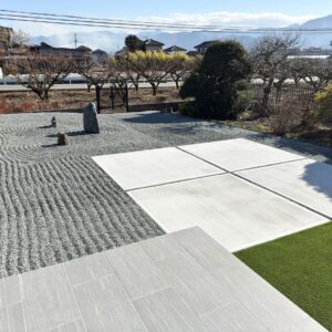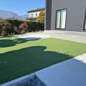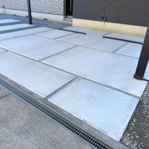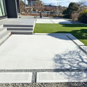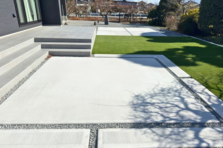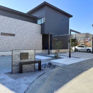 アプローチなどの正面部分は門袖、石張りなど全体的にモノトーンでまとめ、上品な印象に仕上がりました。駐車スペースには高さを上げ、梁を延長させたカーポートSCを採用し、家の外観とも調和しています。リビング前のお庭部分は「バーベキューやプールができるお庭にしたい」というTさまからのご要望を受け、土間スペースと人工芝を組み合わせたお庭を提案しました。ご家族がのびのびと過ごせる憩いの場となっています。