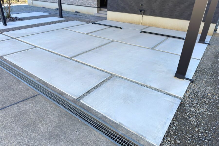 カーポートSCは玄関に近い場所に設置しました。通常の柱の位置だと玄関の正面部分と重なり、歩行ルートの妨げになってしまいます。そこで、梁を延長して柱の位置を外側にずらし、車から玄関までの動線をスムーズにしました。また、駐車の際に車が建物に接触しないよう、車止めも設けました。