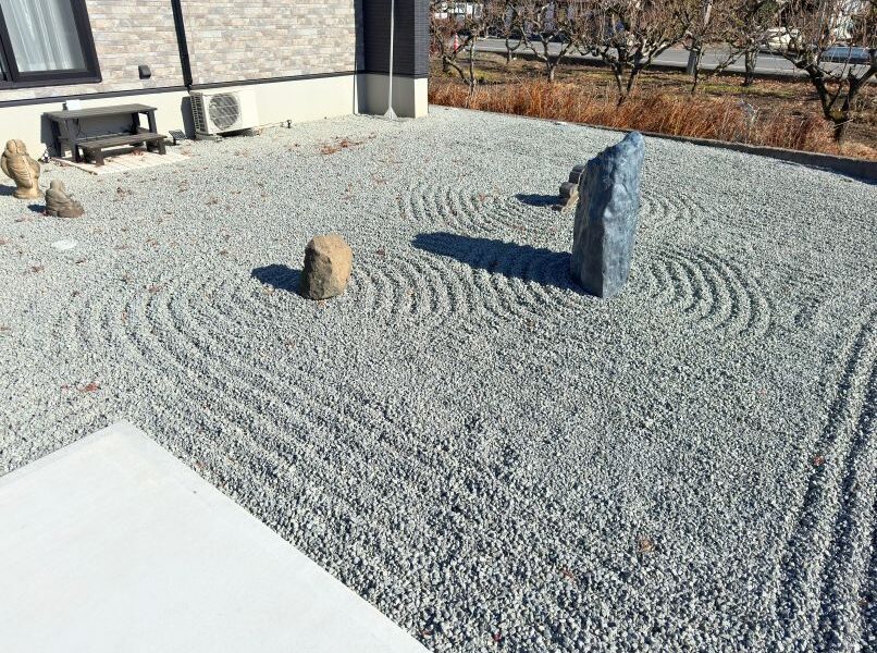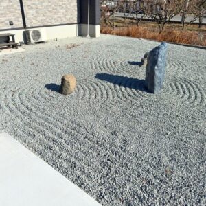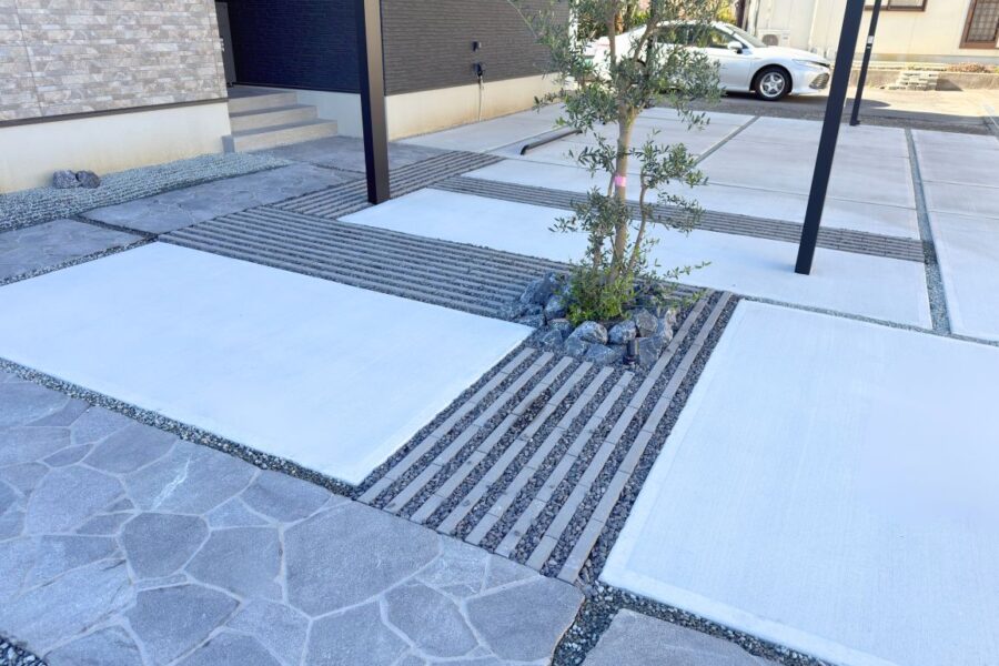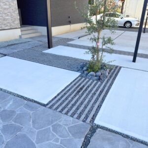 敷地の入り口には、表札やポストを組み込んだ門袖を設置しました。既存のオリーブを活かし、人が通る場所には石張りを施工。さらに周囲には幅5センチのインターロッキングを並べ、その間に砂利を敷き詰めることで印象的なボーダーラインを描きました。入口から玄関までの動線が楽しめます。門袖やオリーブの根元、建物の壁沿いには照明を設置。夜になると柔らかな光が浮かび上がり、昼間とは一味違う雰囲気で、優しく迎えてくれます。